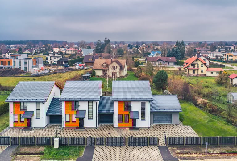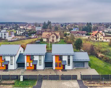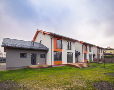 4. Mājas, kas ideāli piemērotas ģimenei, ar nelielu nožogotu zaļā pagalma zonu, kurā varēsiet pavadīt brīvdienas. Katra māja, atsevišķi nodalīta ar garāžām, kā arī sava personīga iebrauktuve ar automātiski veramiem vārtiem un gājēju vārtiņiem.